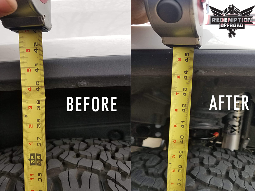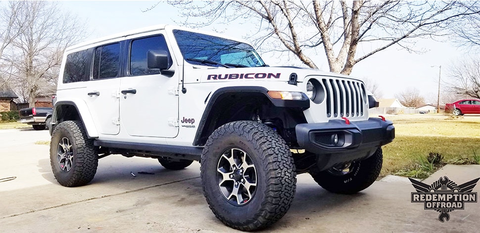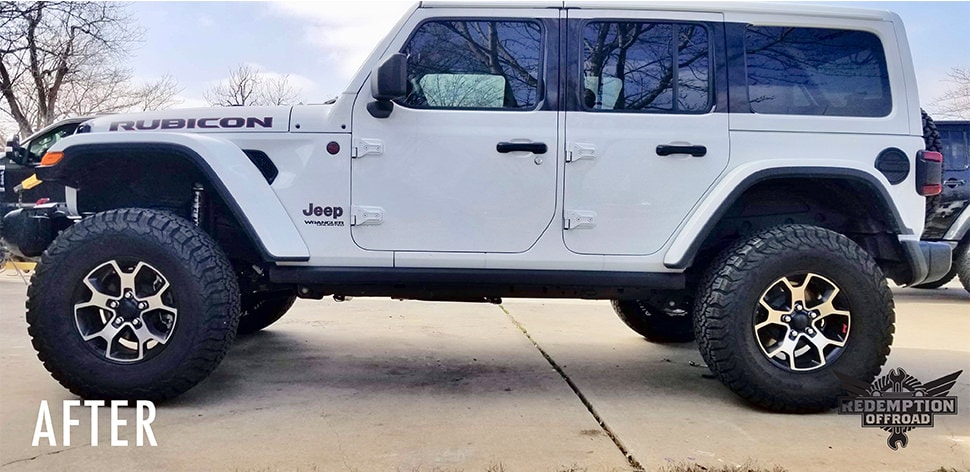 This White JLU got a 2.5 Mopar lift kit installed, as well as a front Rock Krawler Track Bar & Track Bar raise bracket.